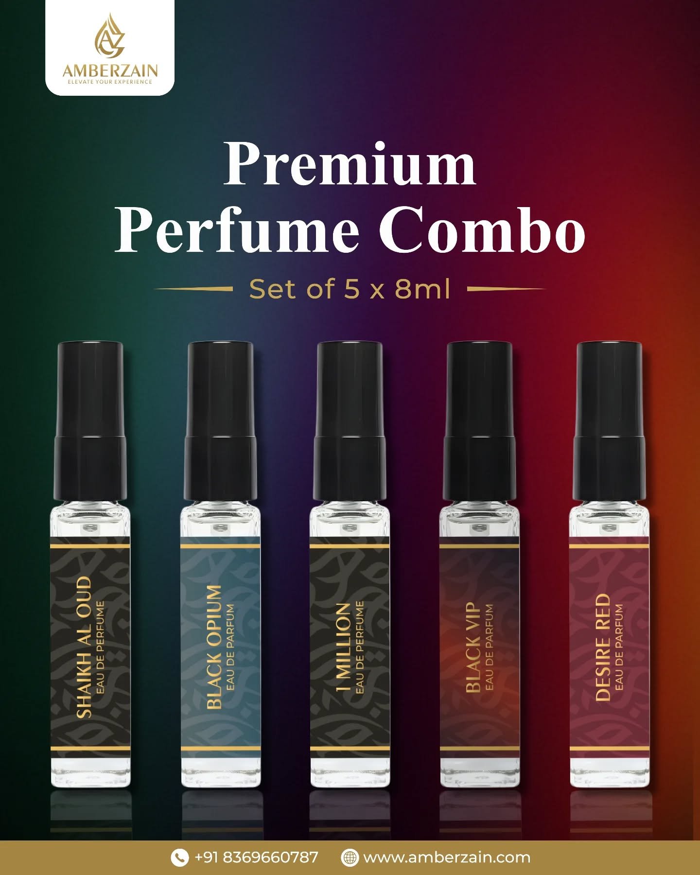 Premium Perfume Combo (Set of 5 x 8ml) – 1 Million, Shaikh Al Oud, Black Opium, Black VIP & Desire Red